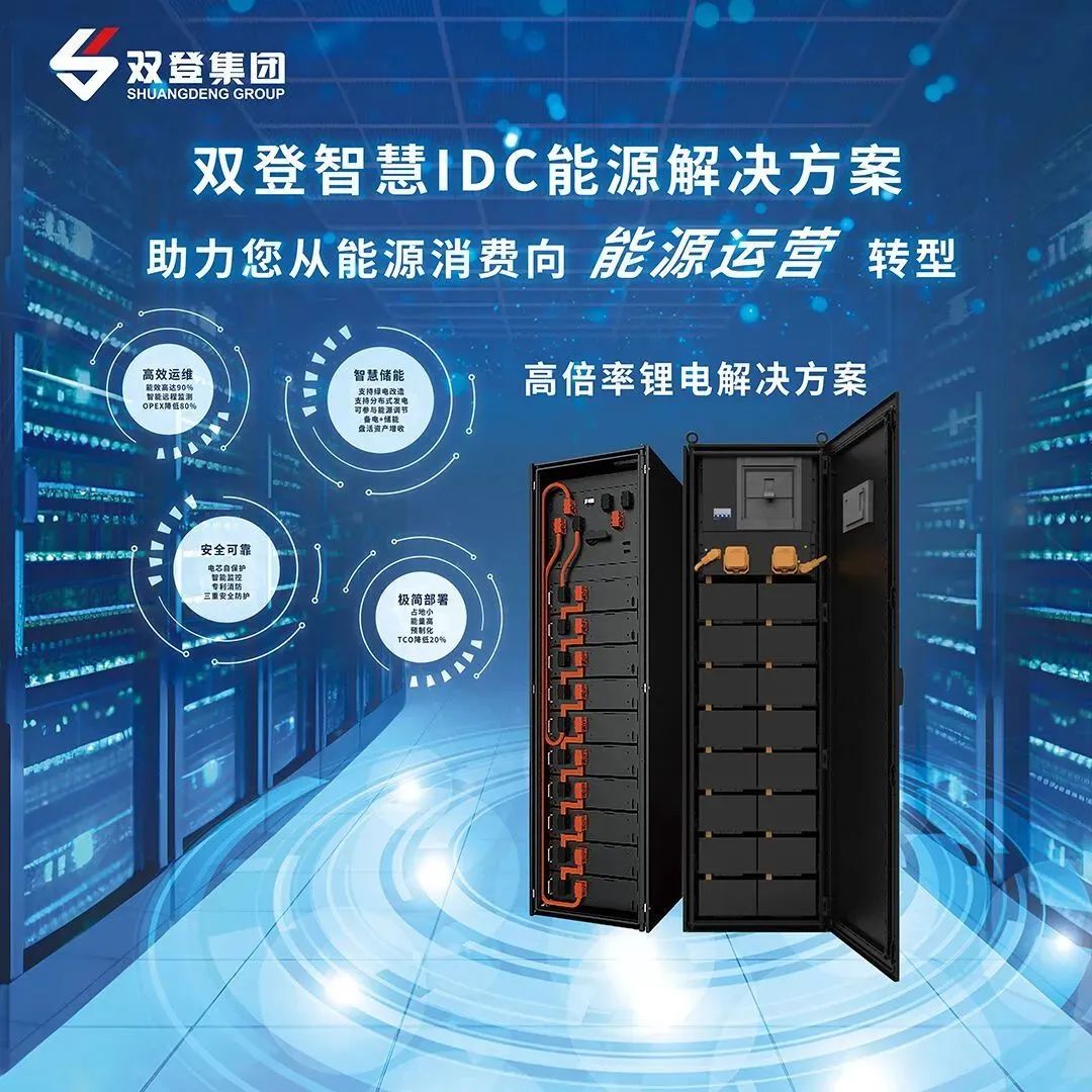 为应对AIDC时代高密化、智能化、可持续的需求,双登推出数据中心高倍率锂电解决方案,标准锂电柜单柜功率高达400KVA,达到行业领先水平,该产品具备高可靠备电、平滑负荷、抗峰增容、削峰填谷等功能,标准机柜方案全系列满足10min-2h备电+储能场景需求,更可支持引入绿电等创新应用,从而显著降低数据中心运营成本,为客户创造更多价值。